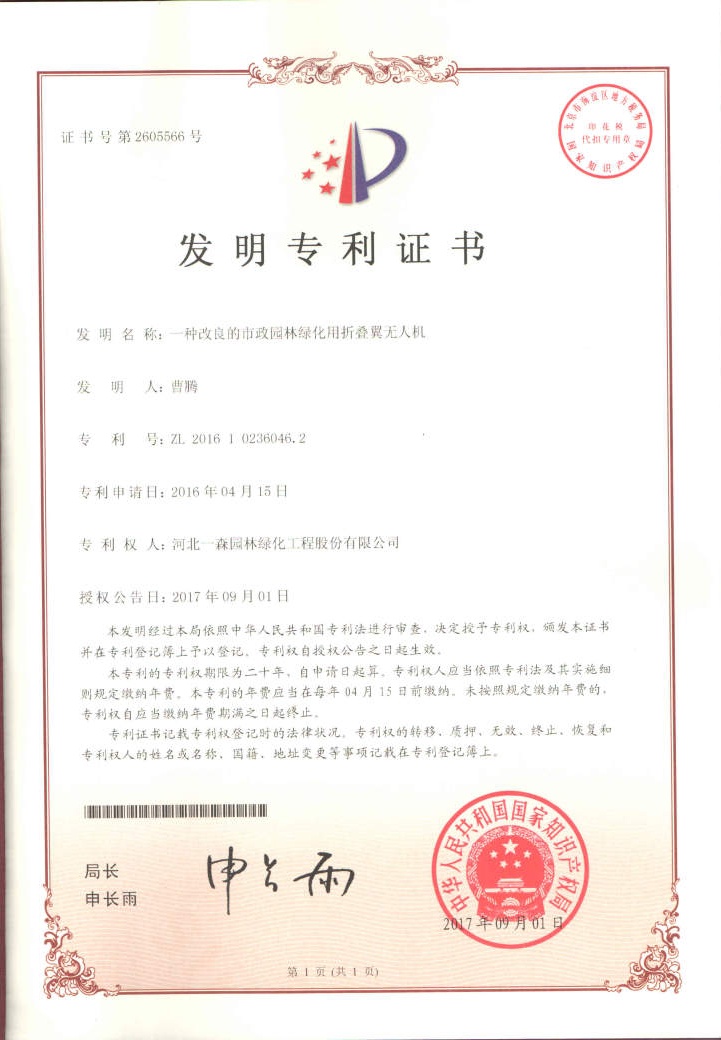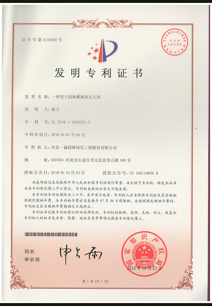 “一種用于園林灌溉的無人機”發明專利證書