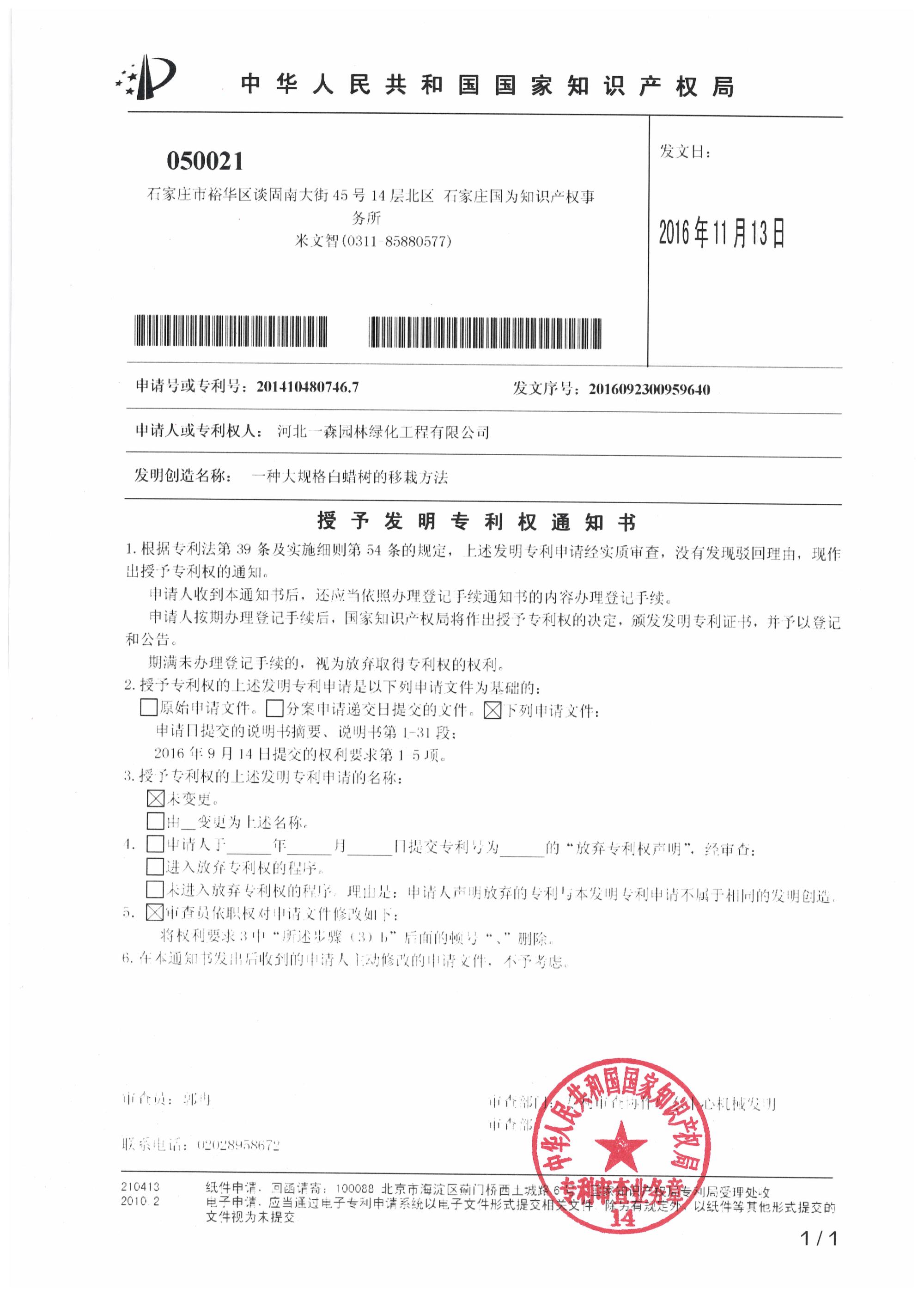 授予發明專利通知書