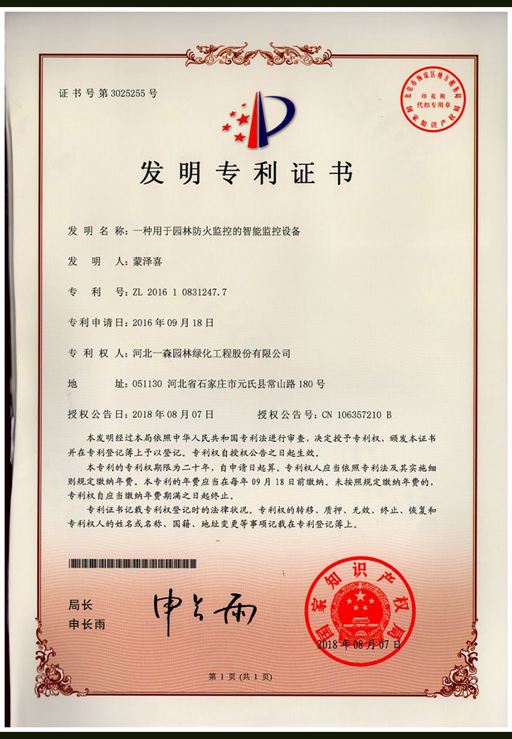 “一種用于園林防火監控的智能監控設備”發明專利證書