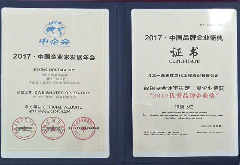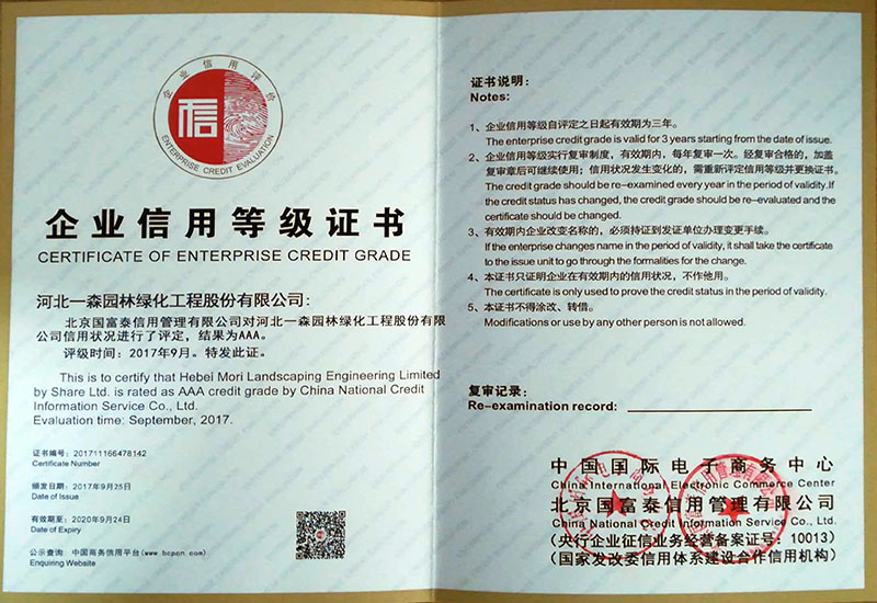 河北省城市園林綠化行業4A級誠信企業